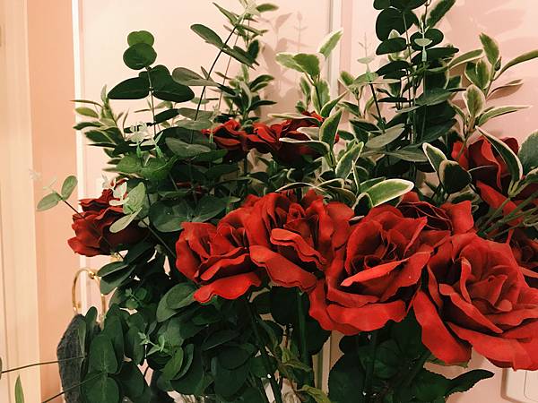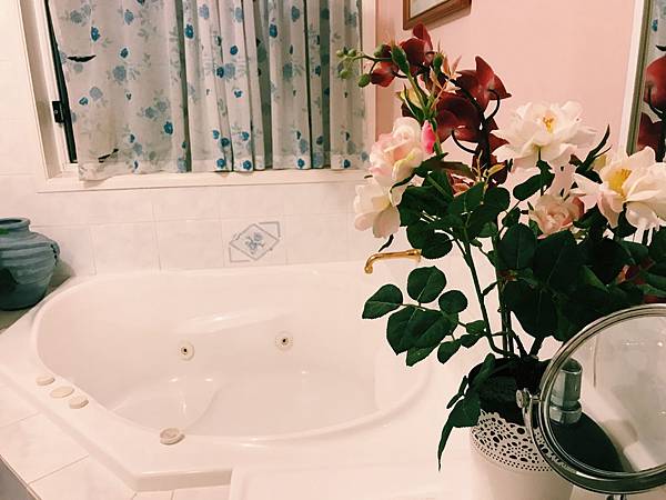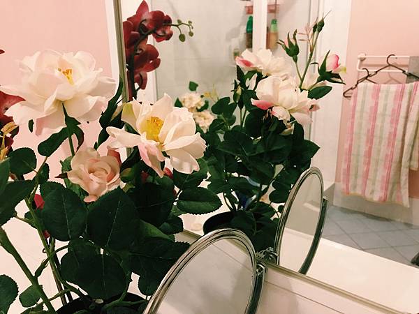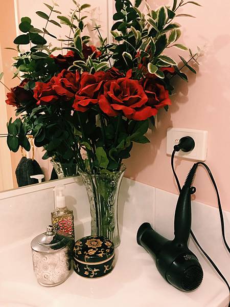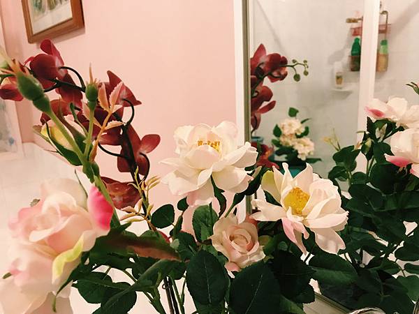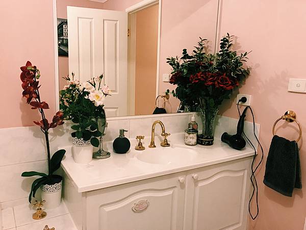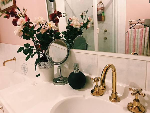 廁所也不馬虎,主人一定是個很浪漫的人,才會把很多重看不重用的東西放在浴室裡。洗手台雖然也是浮誇但是該有的也是有,不該有的也擺出來了。該有的有棉花棒、棉花、乳液跟洗手乳,不該有的就是那些花啊(很明顯吧)!